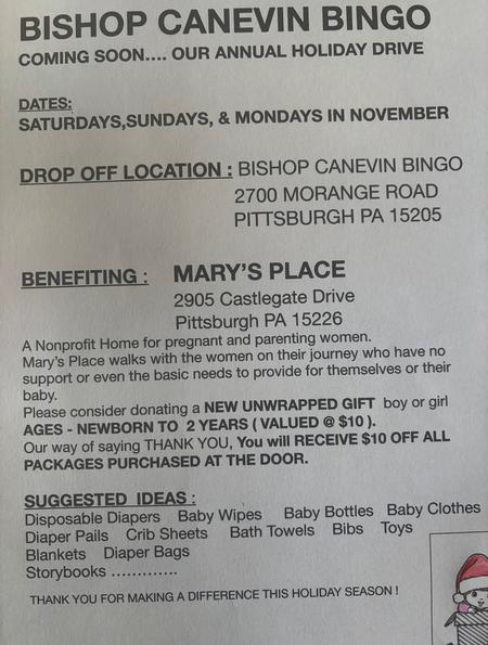 We will be collecting new baby items again this year for Mary's Place. If you bring a gift worth at least $10 to bingo with you during the month of November, you will receive $10 off of your bingo package. We will collect during Zoom sales, and at the door on Saturdays and Sundays.